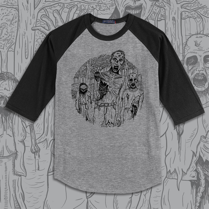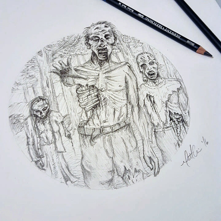 I wanted to do a sweet zombie t-shirt for my personal brand and this is what I came up with. I started with paper and pencil, then did the final inking in Photoshop.